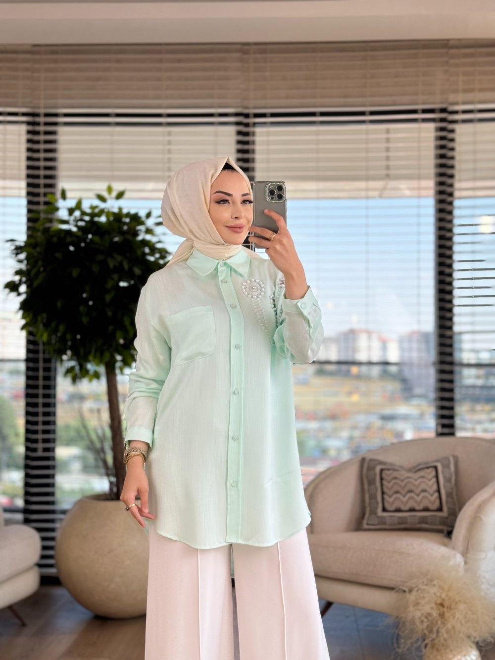 4276 Sağ Göğüs İnci İşlemeli Tunik Mint