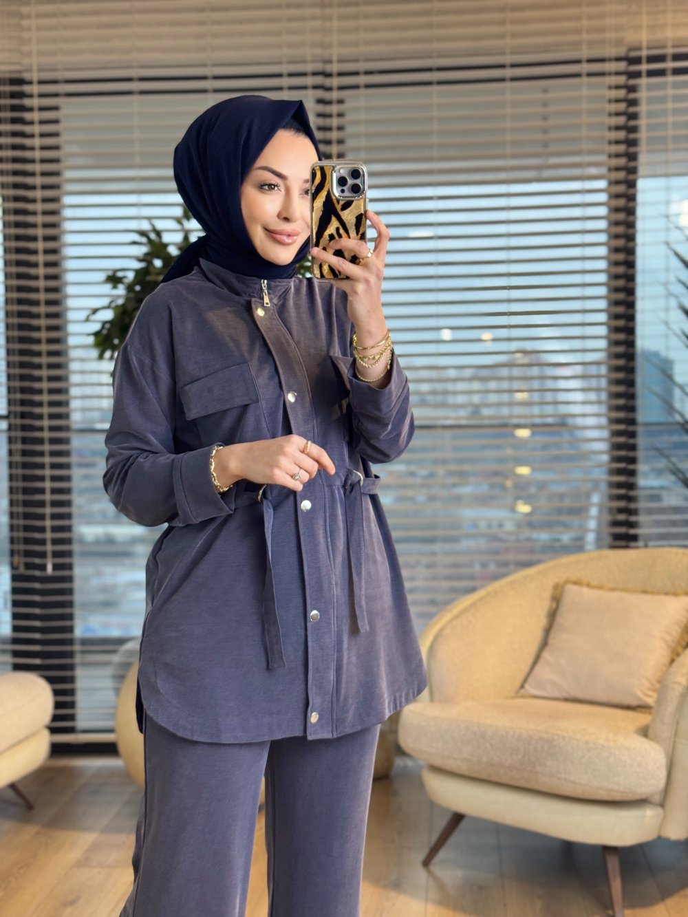 4455 Oysho İki Cepli Kendinden Kuşaklı Takım Lacivert