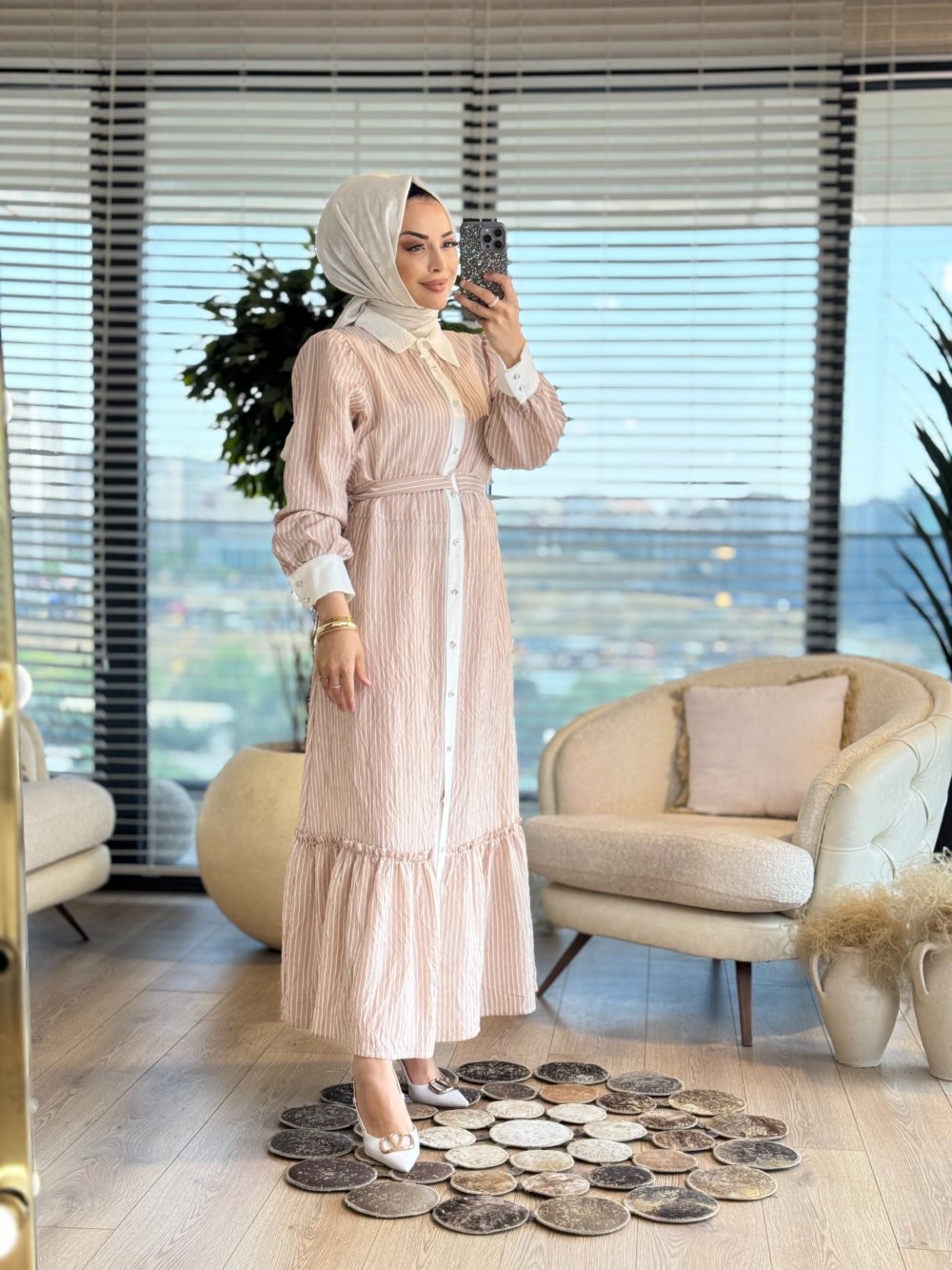 4501 Boyuna Çizgili Elbise Bej