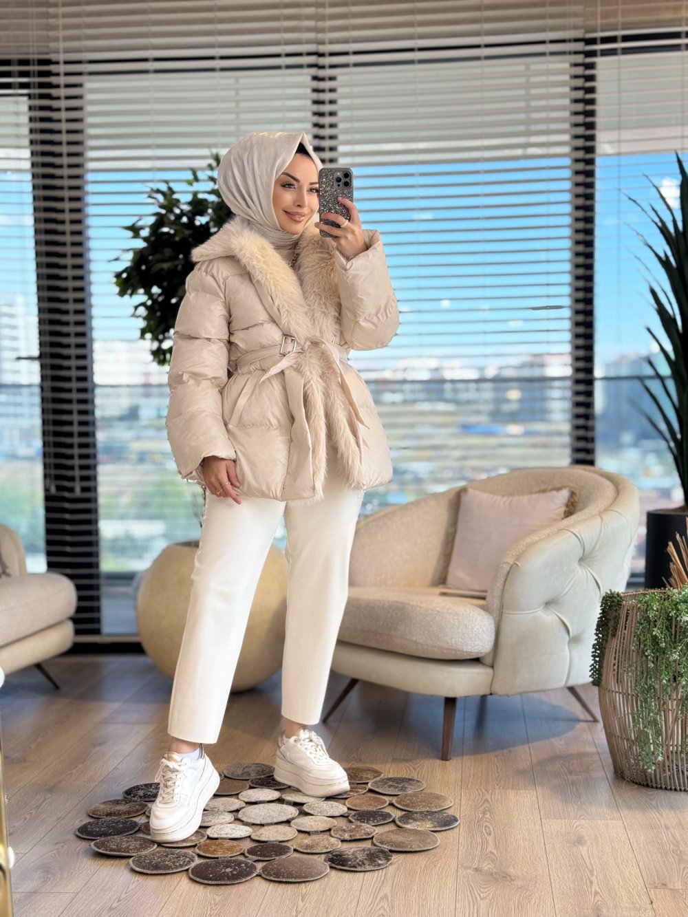 4605 Yakası Kürklü Şişme Kısa Kaban Bej