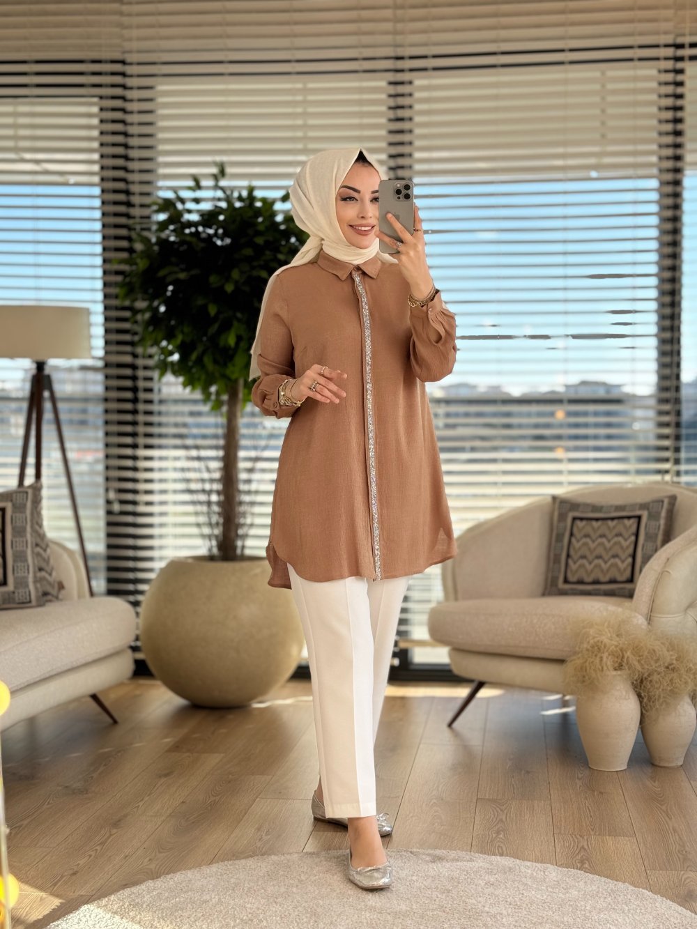 5033 Patı Taş Detaylı Kırışık Kumaş Tunik Latte