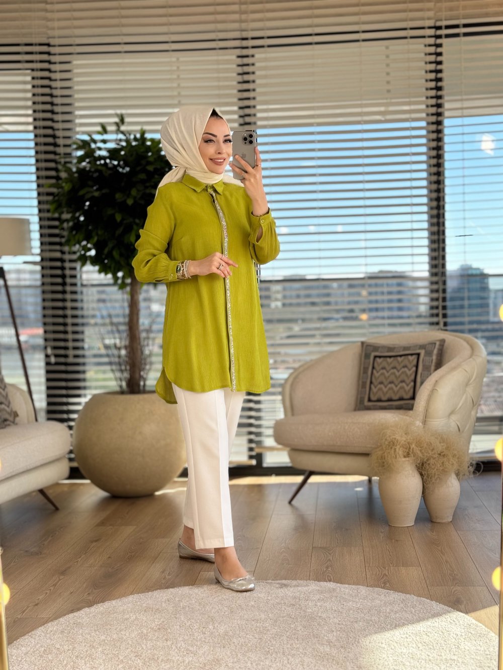 5033 Patı Taş Detaylı Kırışık Kumaş Tunik Yağ Yeşili