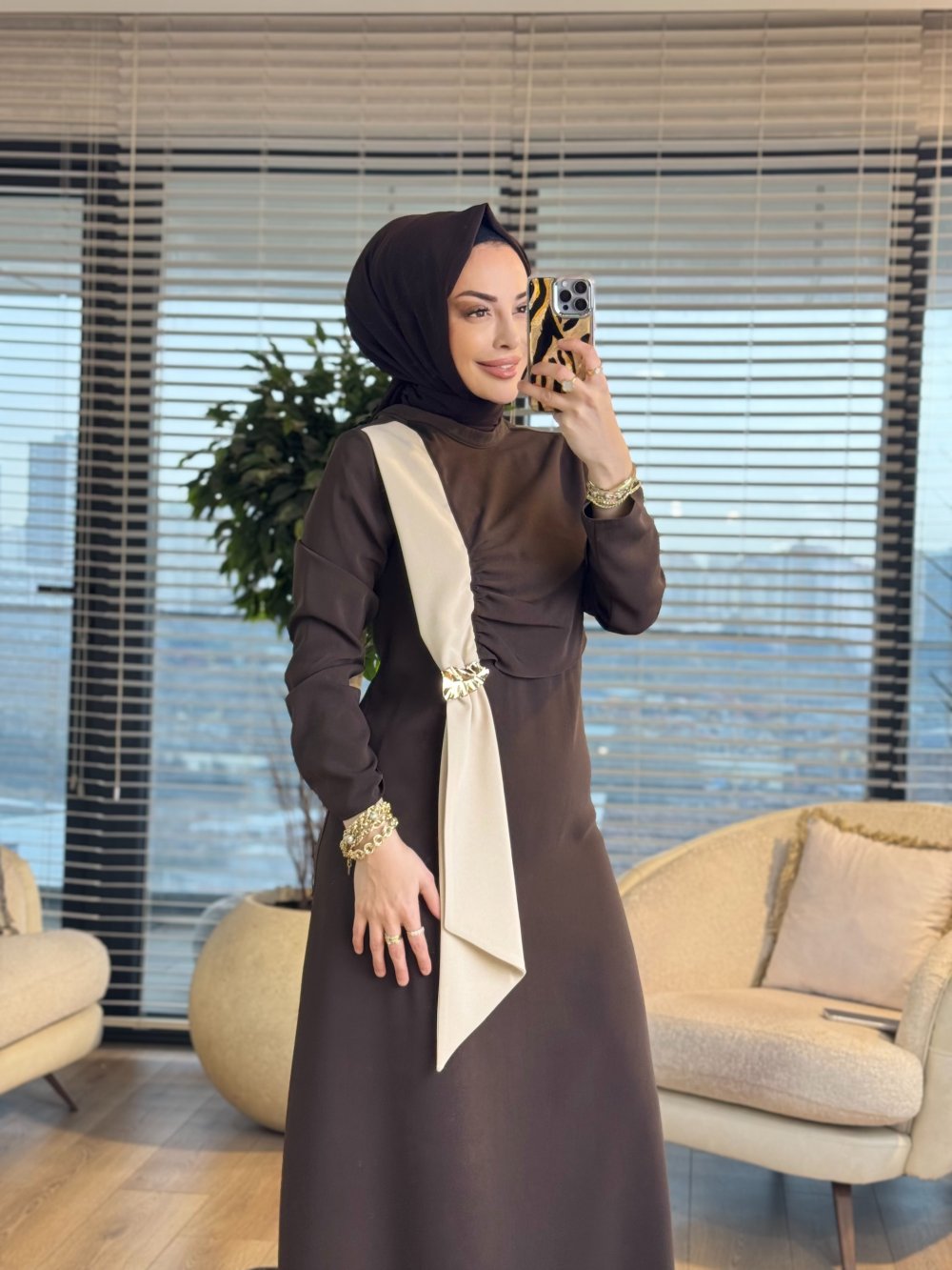 5219 Roba Parça Ve Toka Detaylı Elbise Kahve