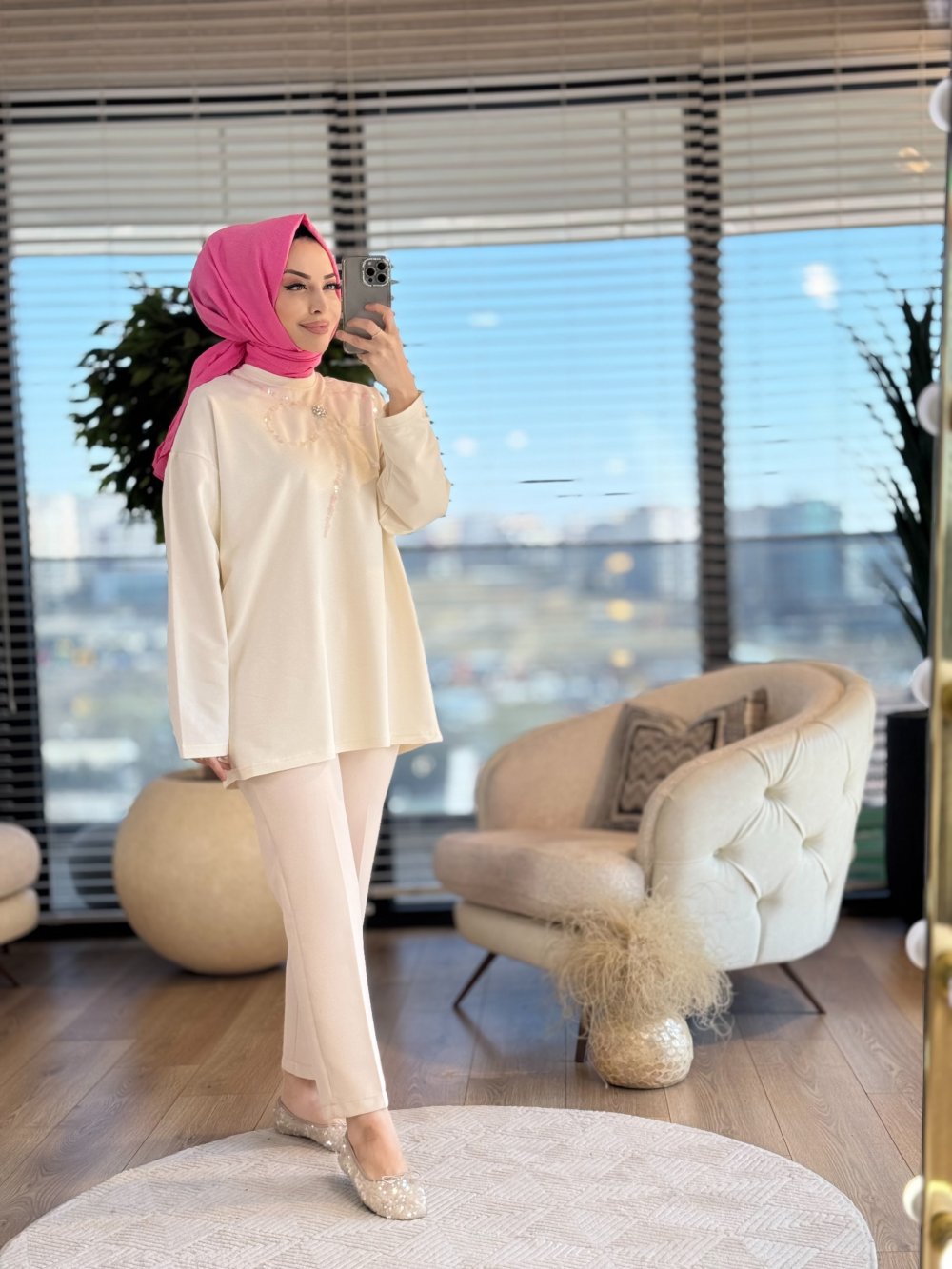 5465 Ön Büyük Fiyonk Pul İşlemeli Tunik Ekru