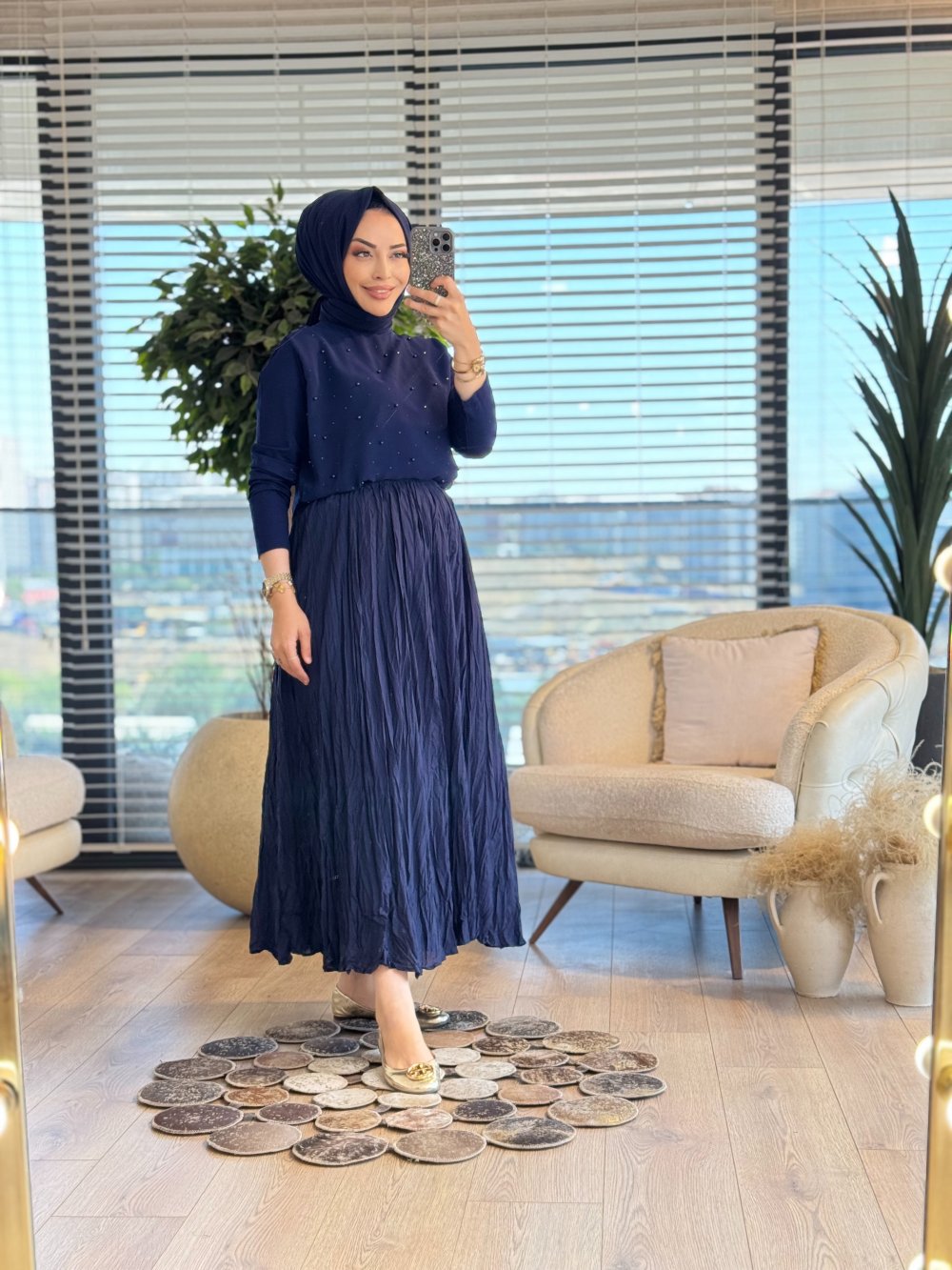 577 Ön Şifon Üstü Taşlı Bluz Lacivert