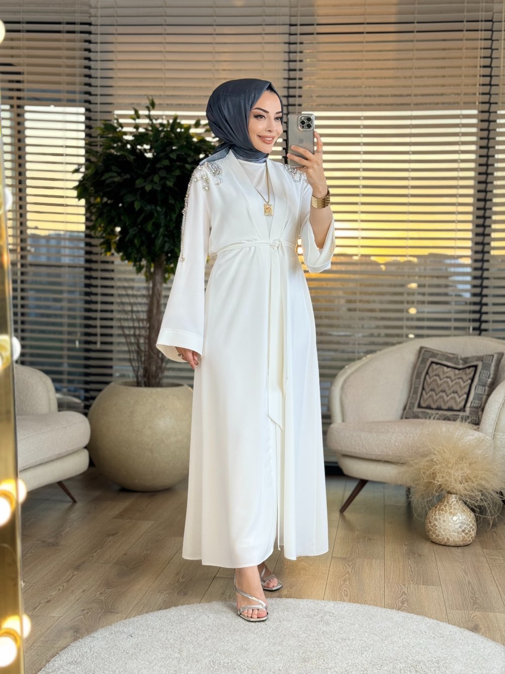 6136 Kolları Elişi Taş İşlemeli Abaya Ekru