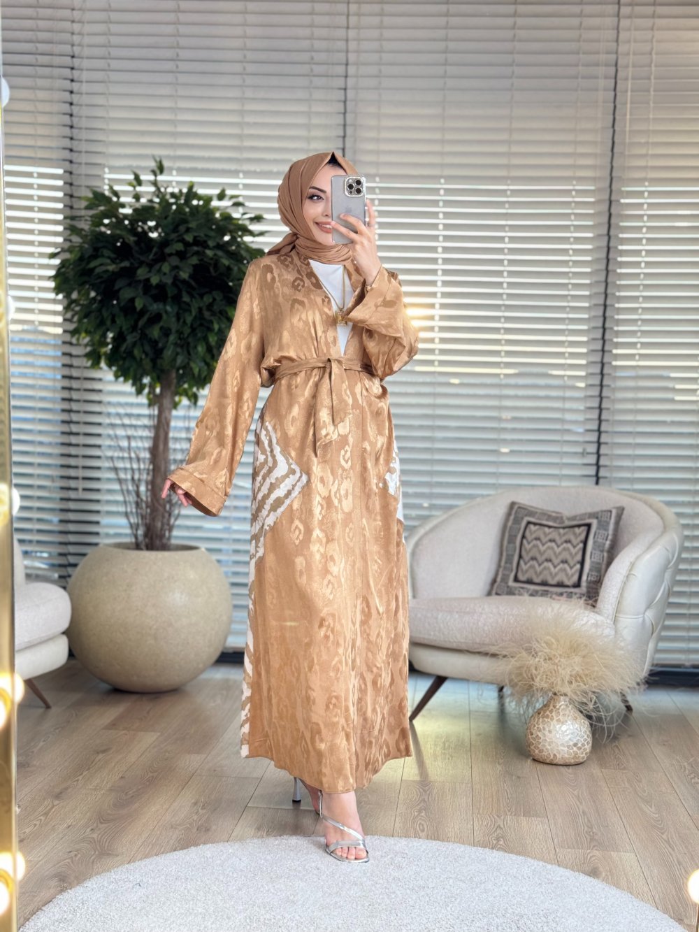 6169 Arka Desenli Garnili Abaya Bej