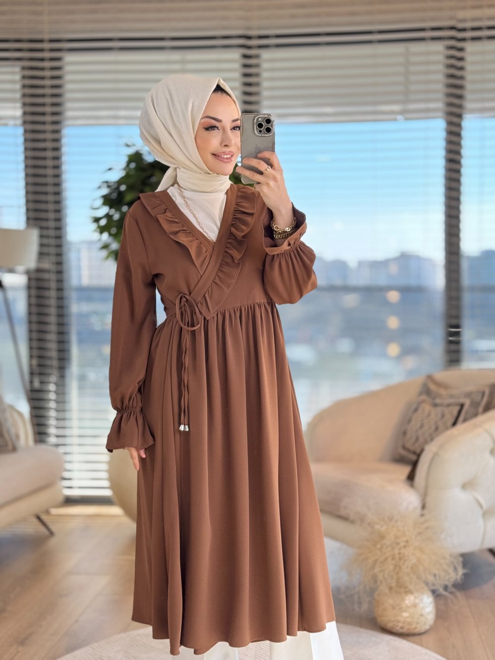 8593 Yandan Bağlamalı Yaka Kenarı Fırfırlı Elbise Kahve