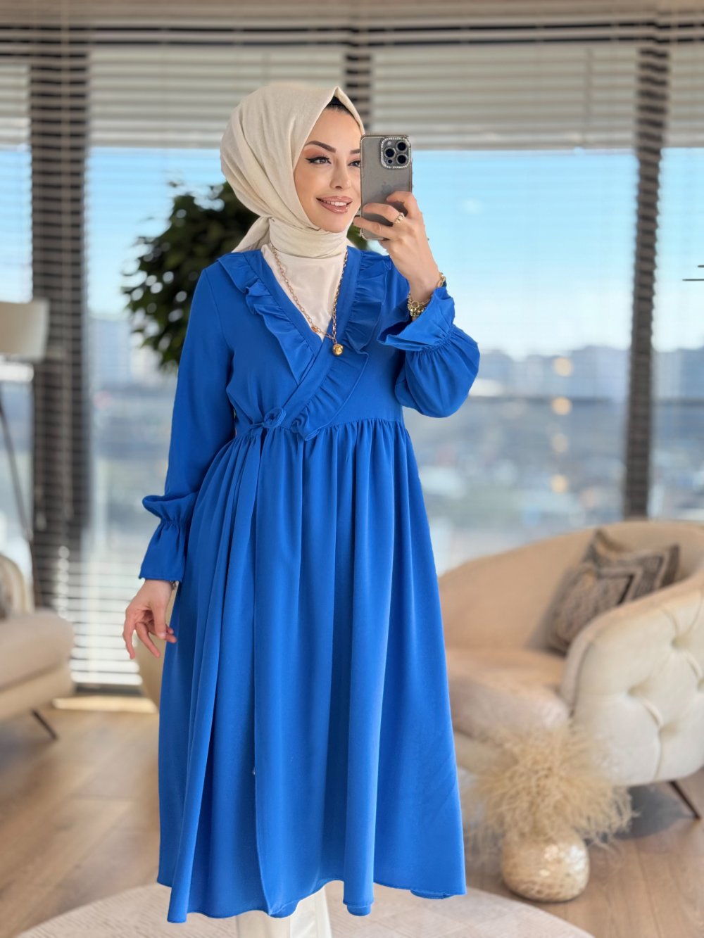 8593 Yandan Bağlamalı Yaka Kenarı Fırfırlı Elbise Saks