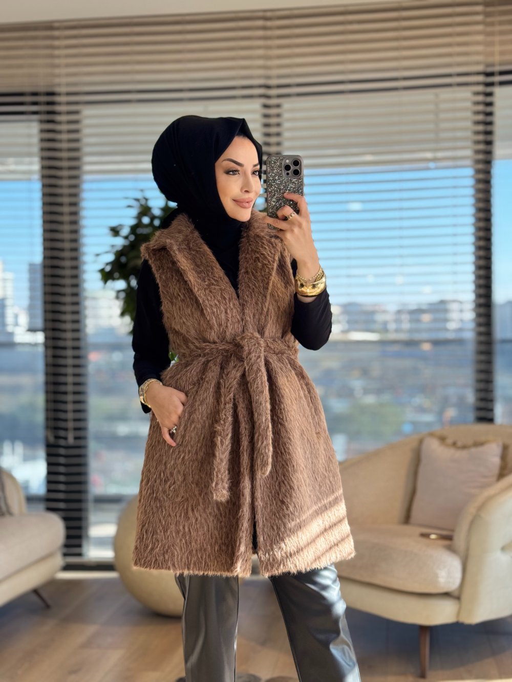 70082 Saçak Yakalı Uzun Yelek Kahve