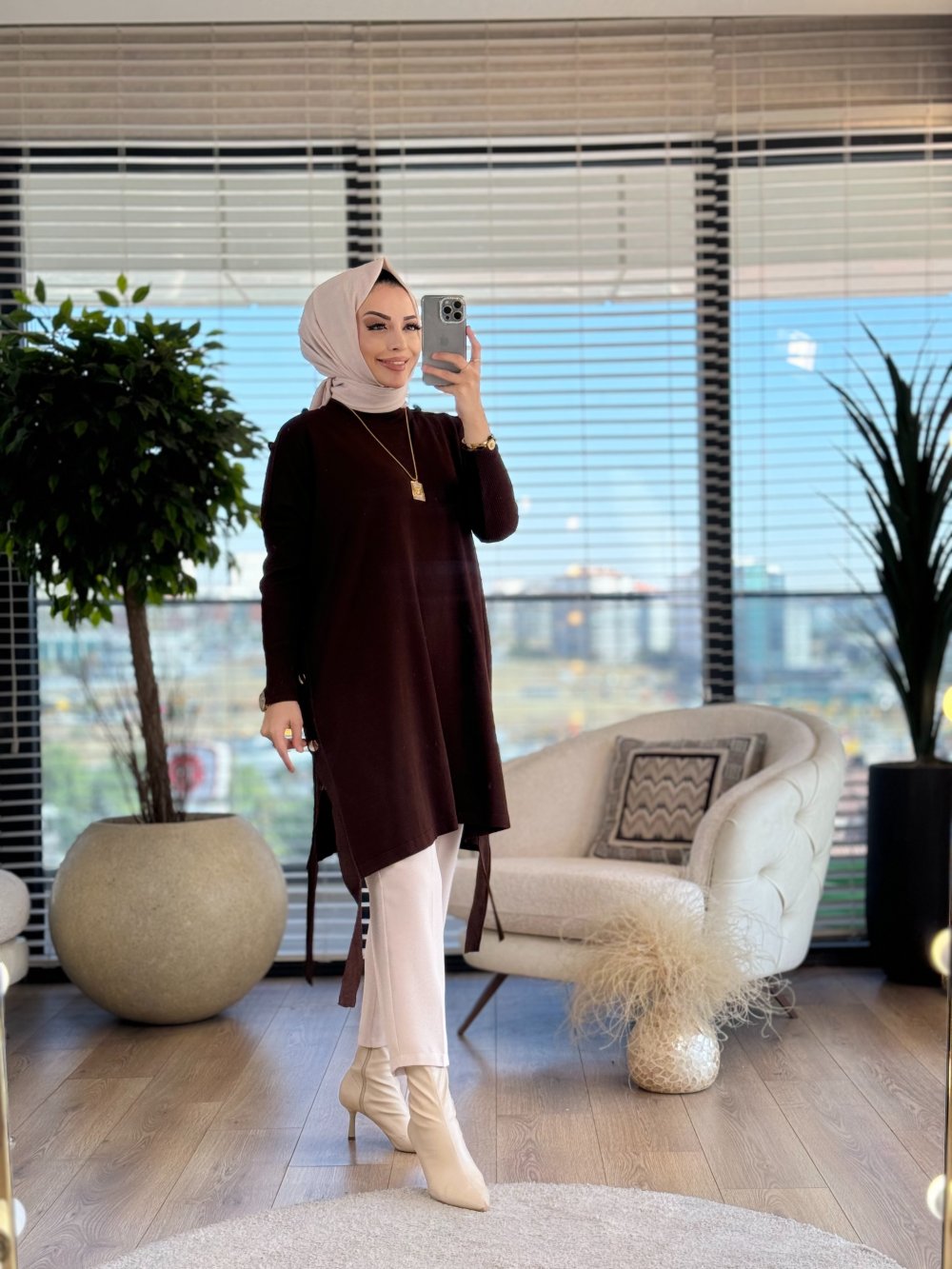 7011 Dicle Yanları Düğmeli Tunik Kahve