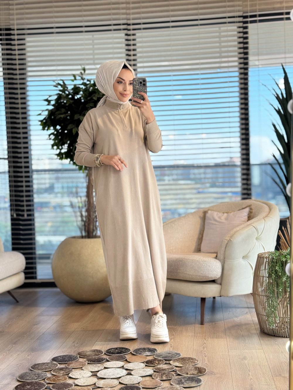 7025 Patı Fermuarlı Vanezia Elbise Bej