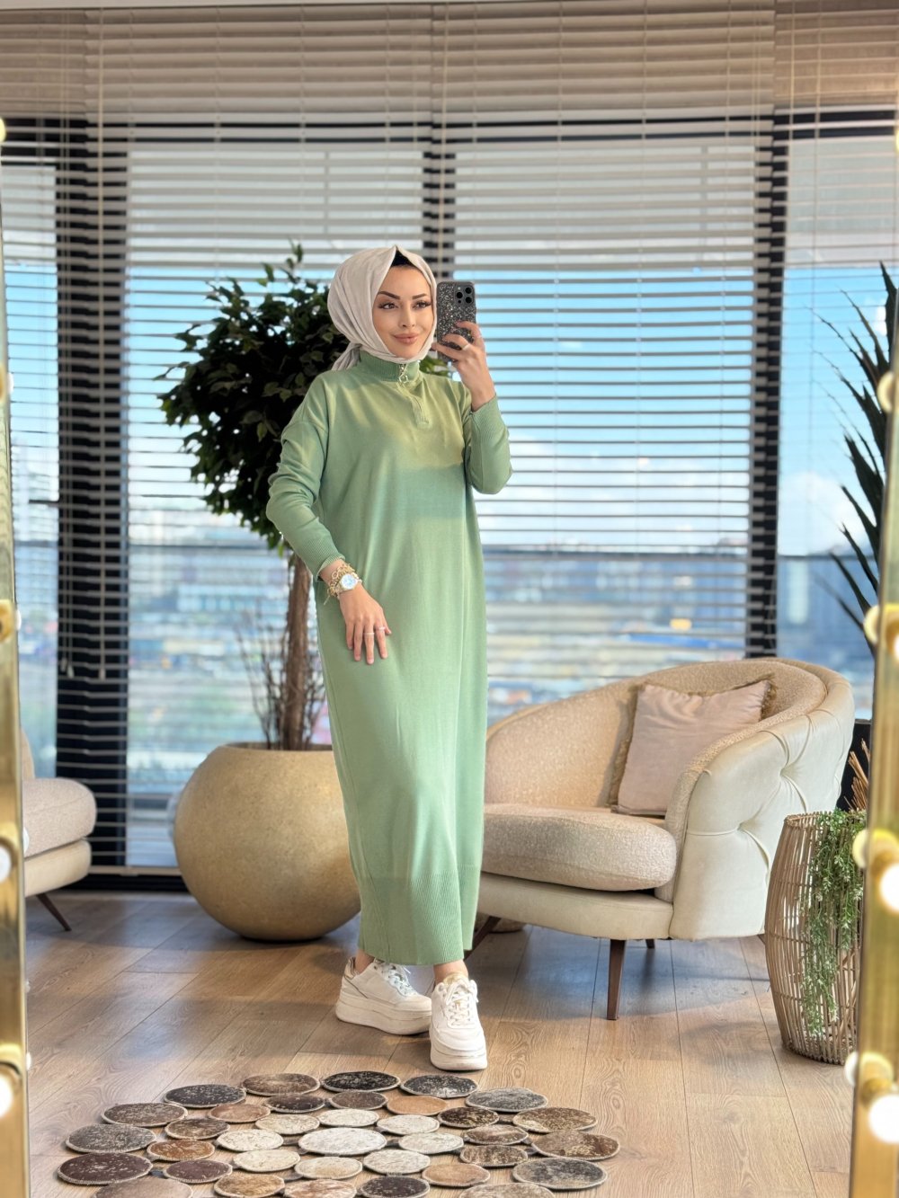 7025 Patı Fermuarlı Vanezia Elbise Çağla