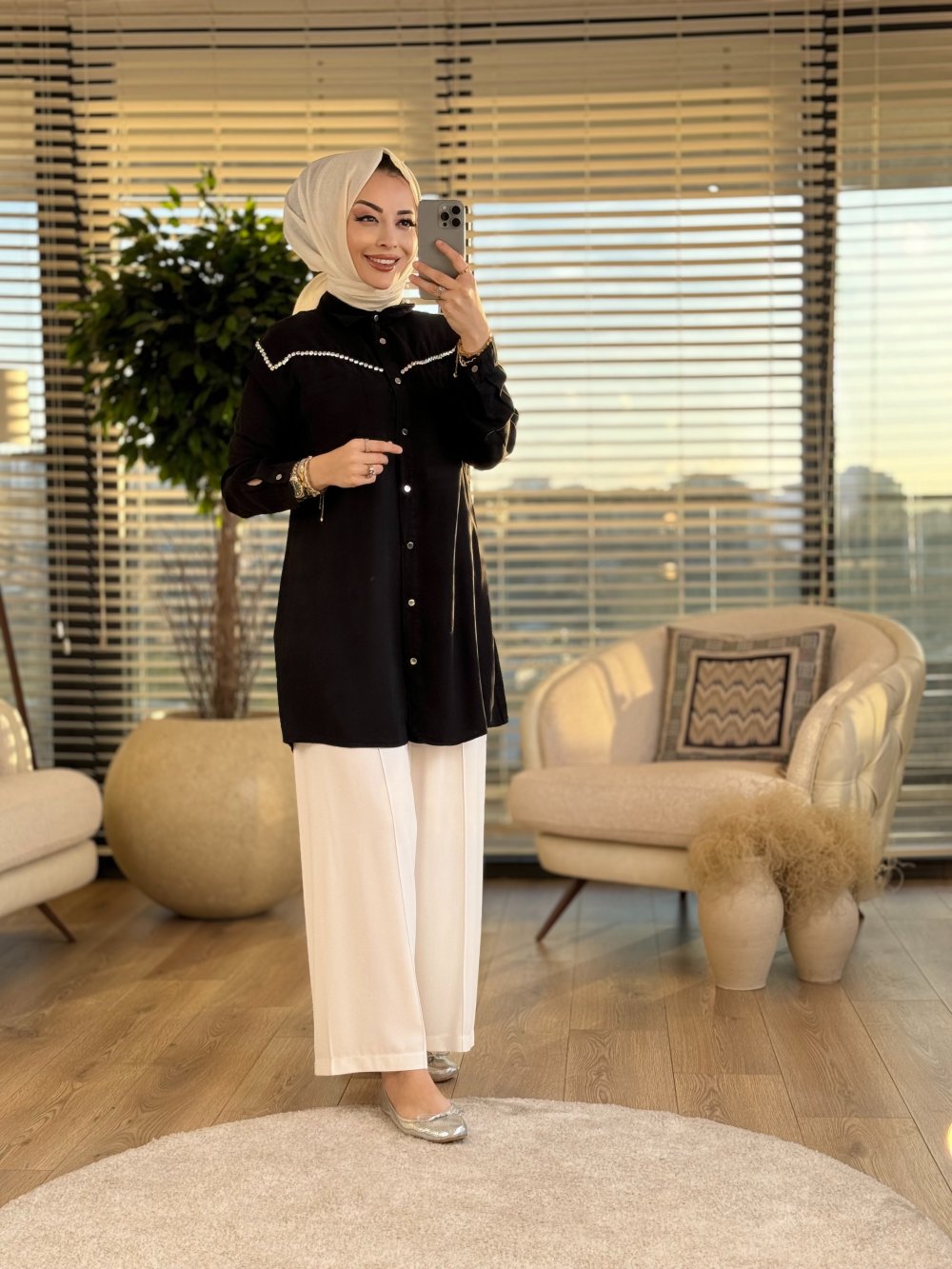 7109 Roba V Taş Detaylı Tencel Tunik Siyah