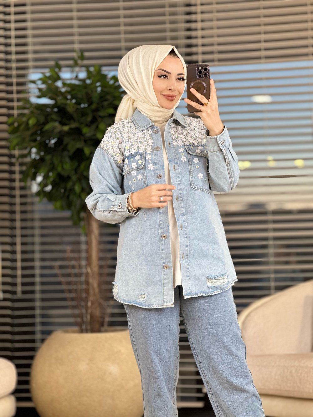 7120 Roba Pul Çiçek İşlemeli Kot Ceket Mavi