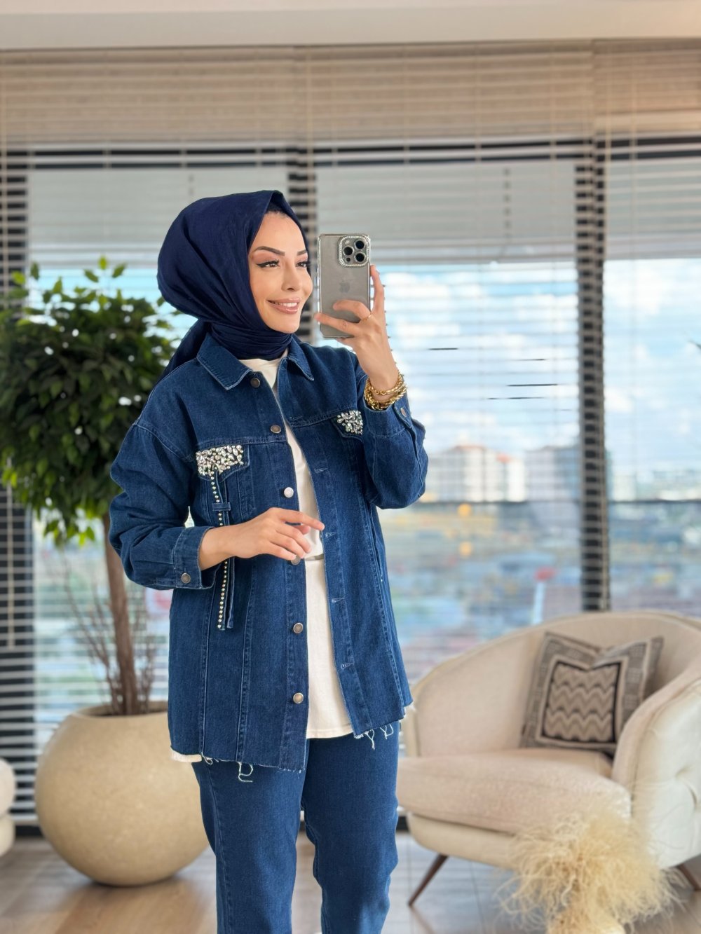 7206 Cep Kapaği Taş İşlemeli Kot Ceket Lacivert