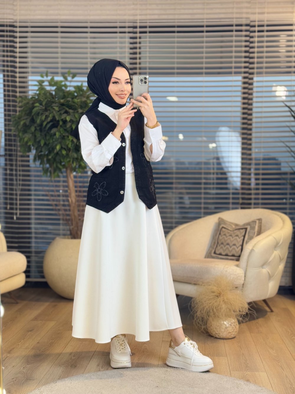 7249 Ön Çiçek Nakışlı Kot Yelek Siyah