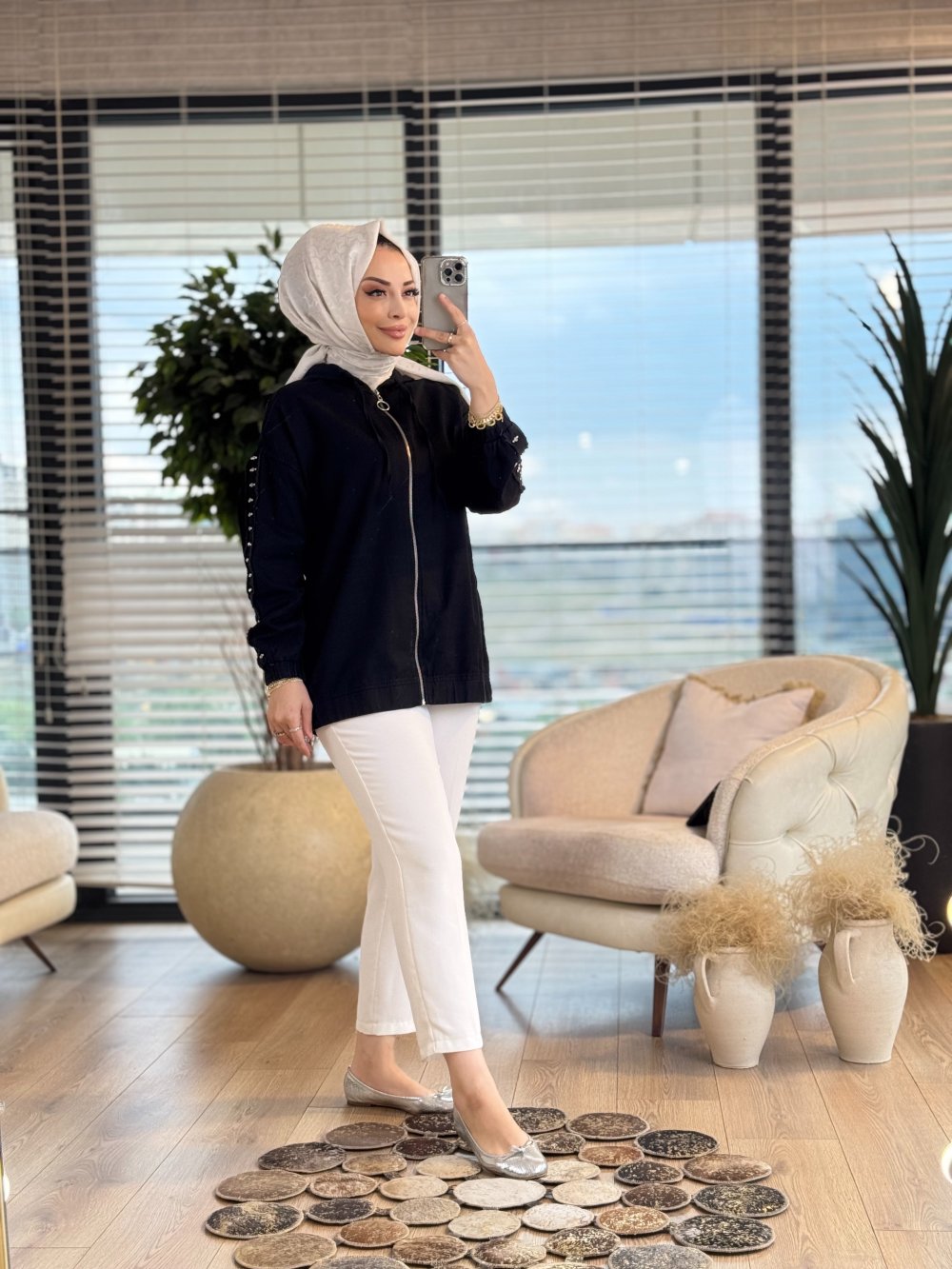 7251 Kot Kolları Taş İşlemeli Kapşonlu Mont Siyah