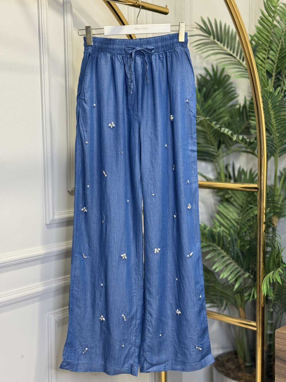7261 Tencel Önü Taş İşlemeli Pantolon Mavi