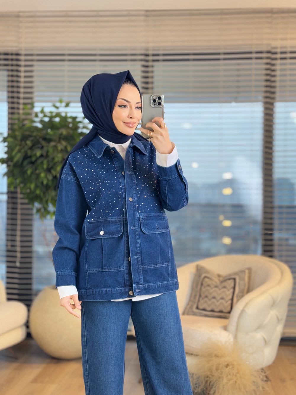 7272 Kot Önü Serpme Taşlı Ve Cepli Ceket Lacivert