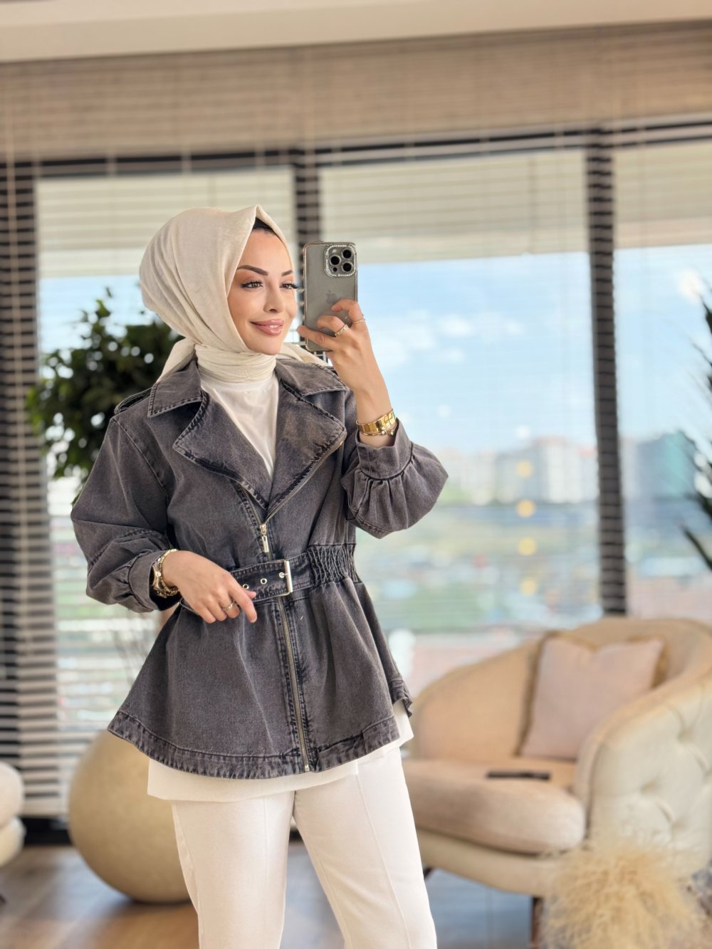 7306 Yandan Fermuarlı Beli Lastikli Ceket Gri
