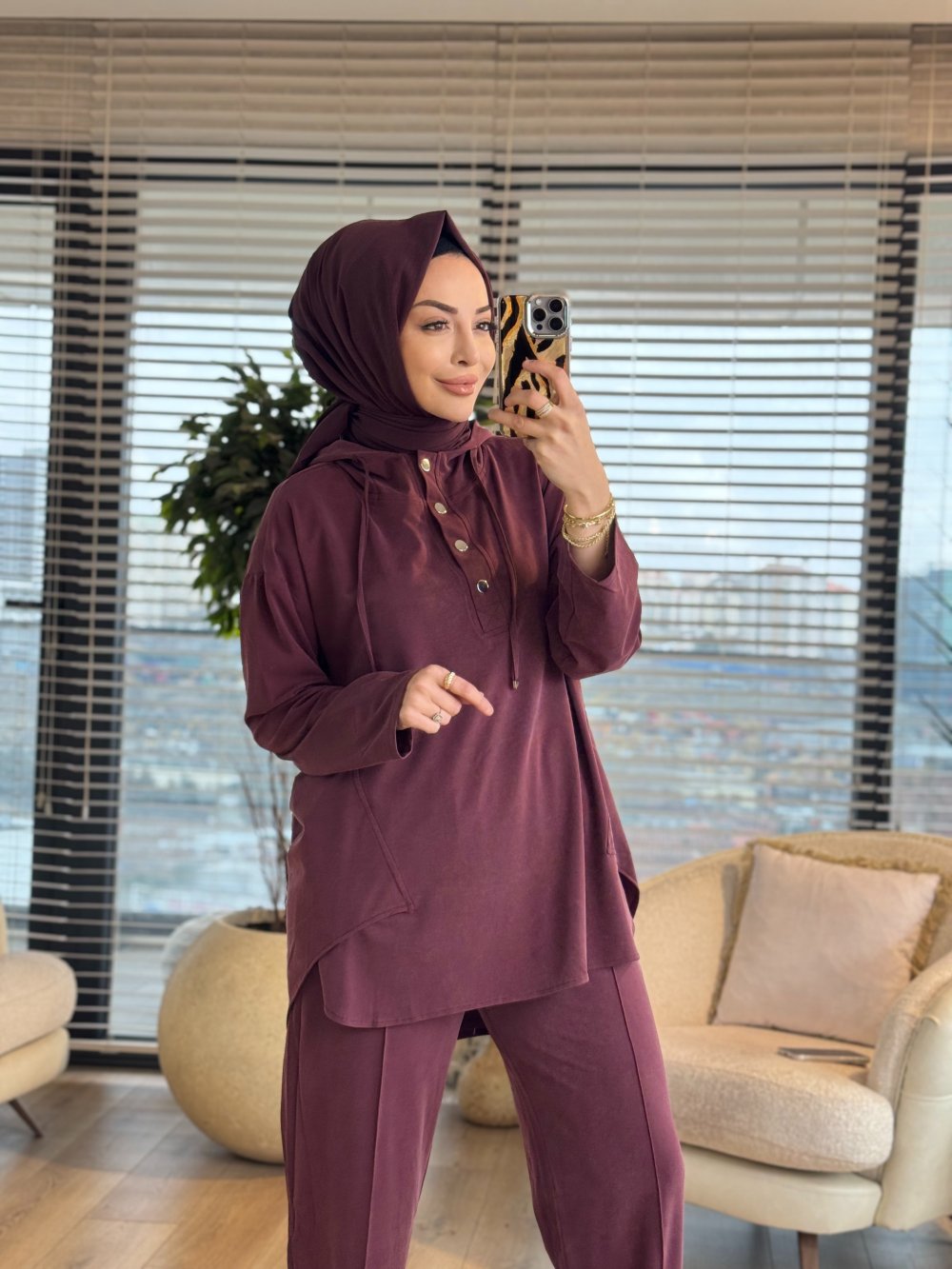 7416 Oysho Kapşonlu Patı Çıtçıtlı Takım Bordo
