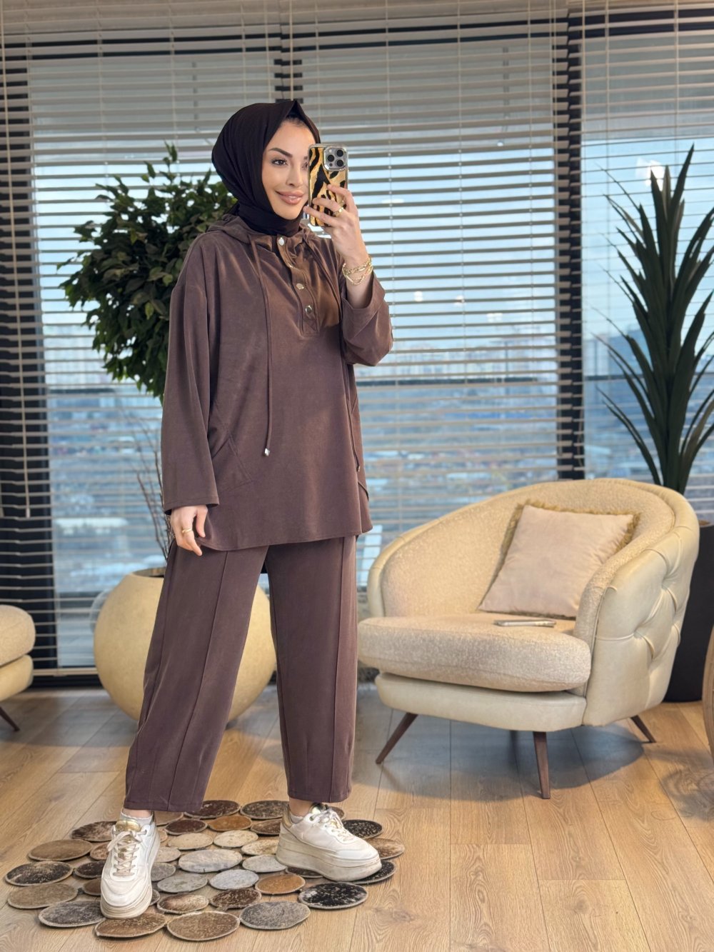 7416 Oysho Kapşonlu Patı Çıtçıtlı Takım Kahve