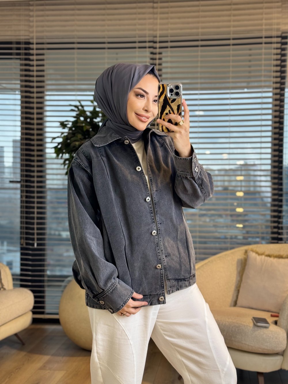 7458 Omuzları Pile Detaylı Kot Ceket Gri
