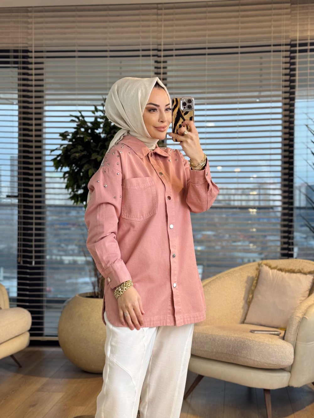 7486 Omuz Zımba Yıldız Detaylı Kot Ceket Gül