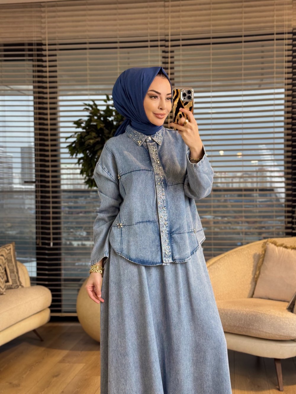 7502 Patı Yakası Taşlı Kot Etekli Takım Mavi