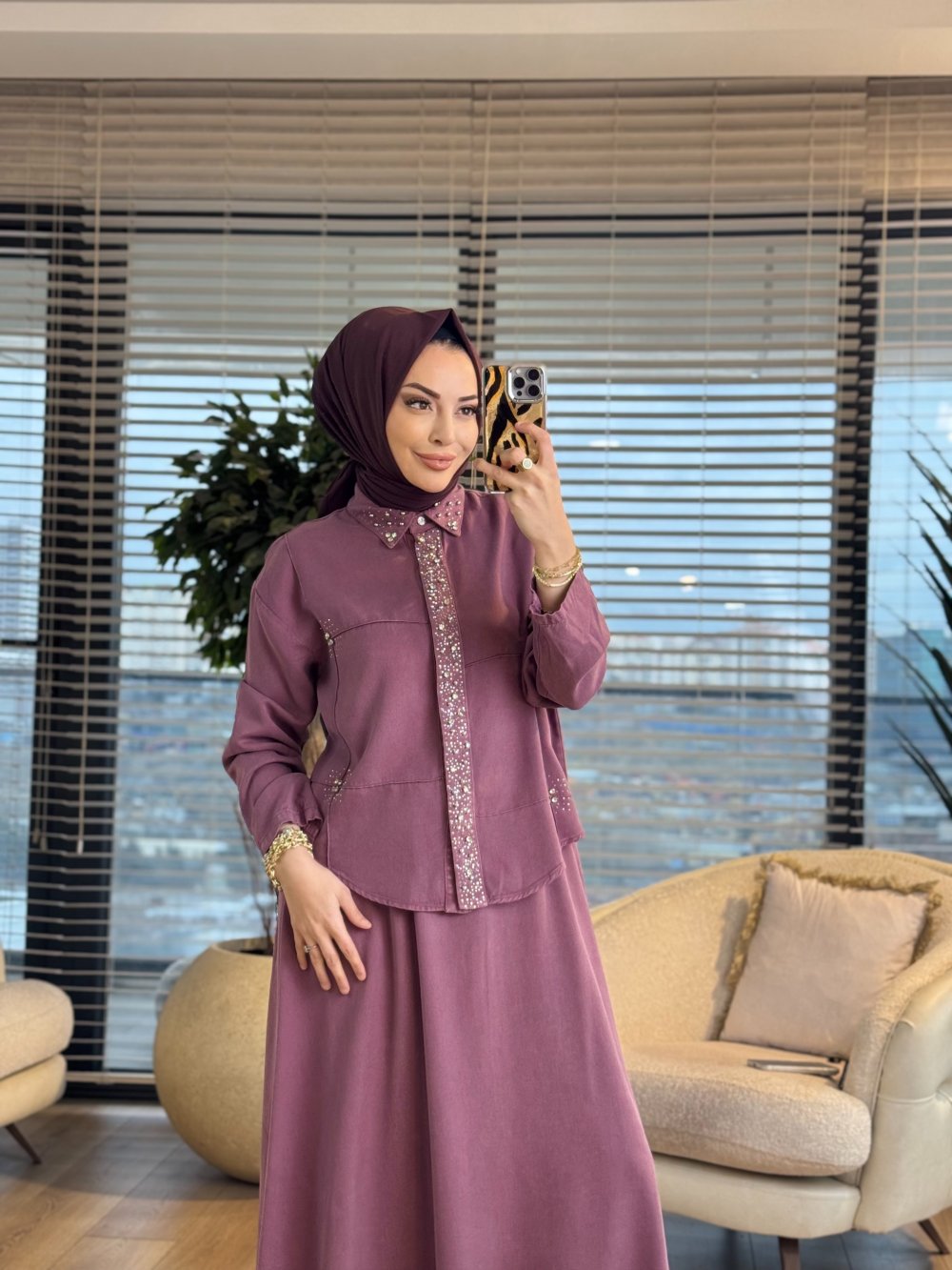 7502 Patı Yakası Taşlı Kot Etekli Takım Mürdüm