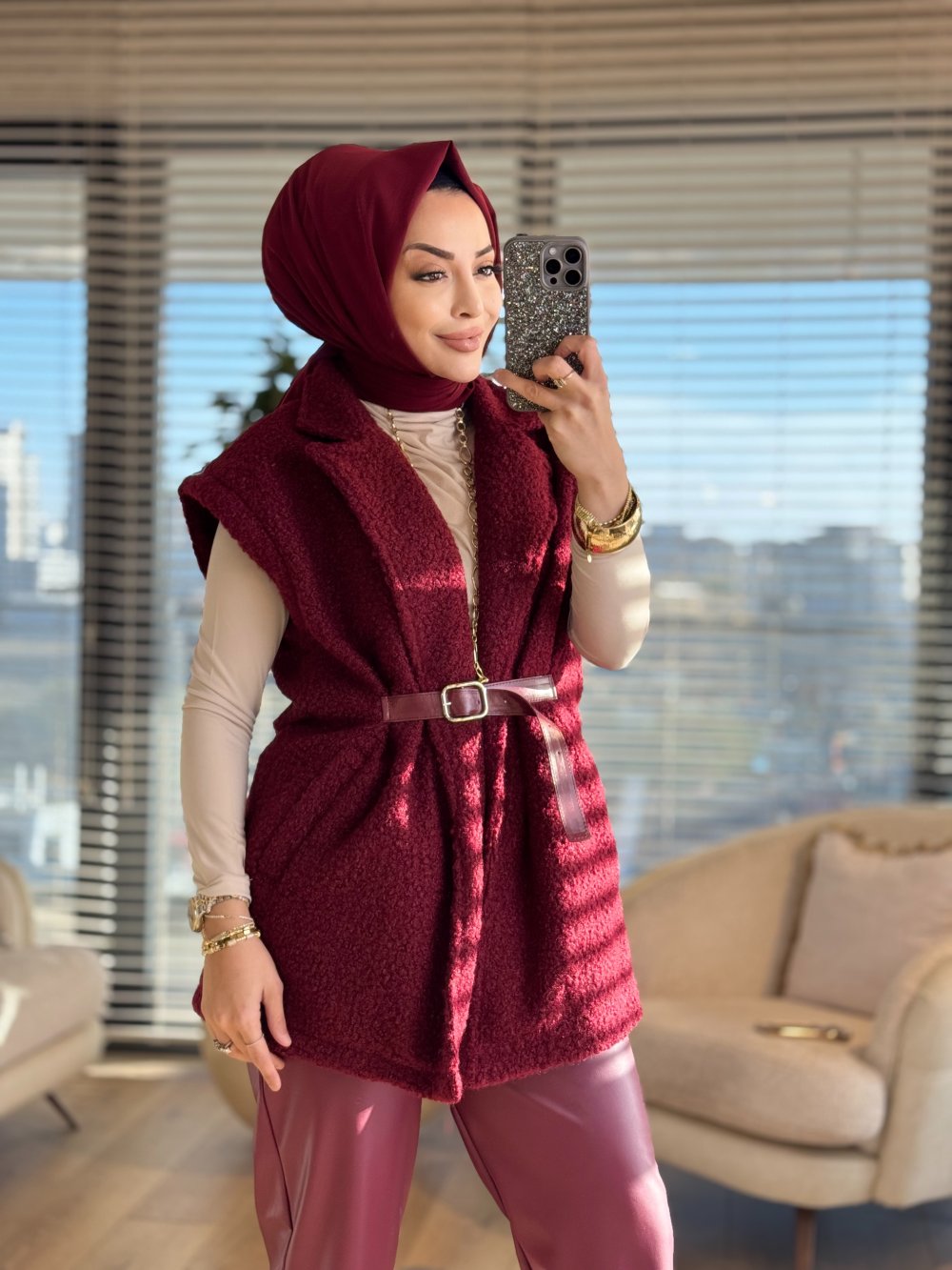 7979 Bukle Kemer Detaylı Yelek Bordo