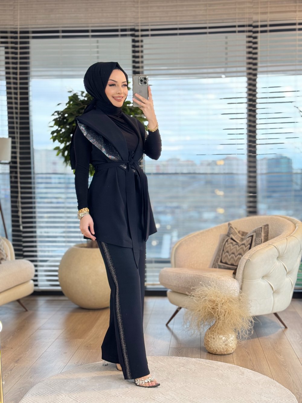 8498 Yaka Ve Pantolon Kenarı Taş Baskılı Yelekli Takım Siyah