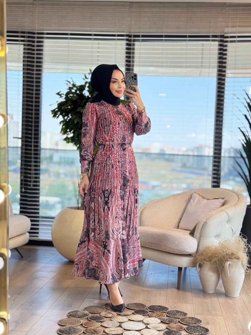 91086 Saten Etnik Desen Piliseli Elbise Bordo