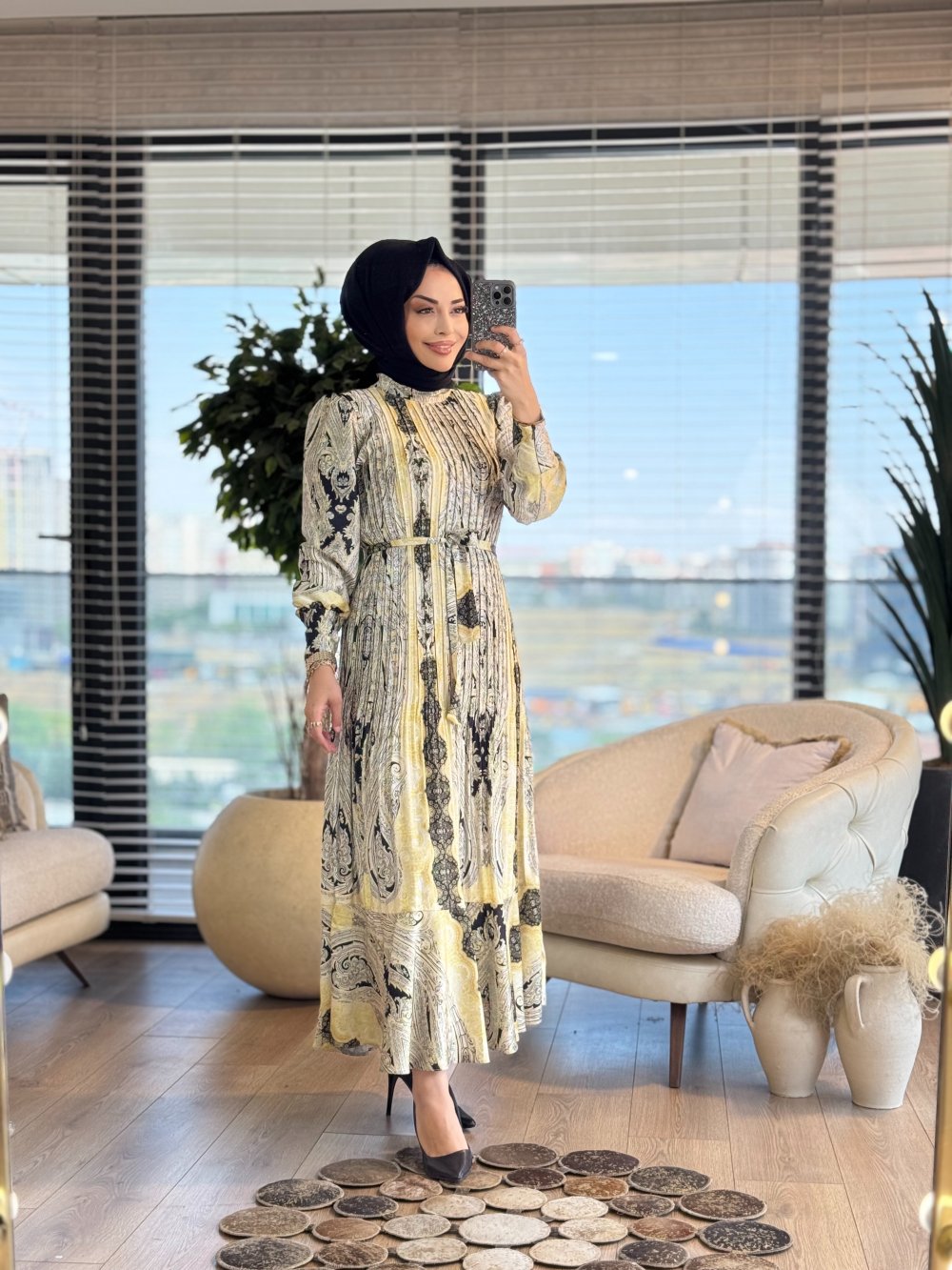 91086 Saten Etnik Desen Piliseli Elbise Yağ Yeşili
