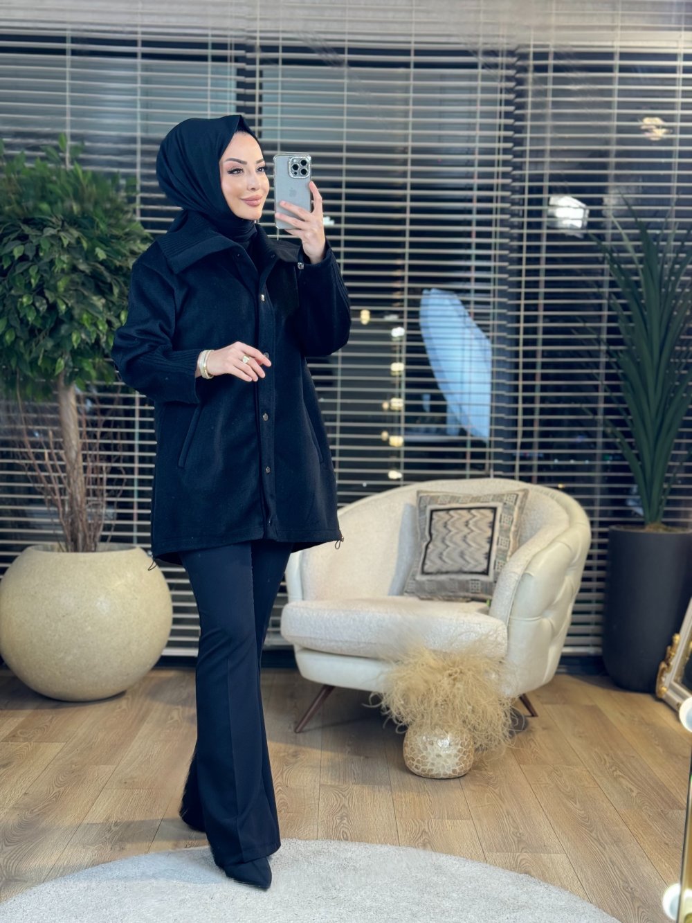 9229 Kaşe Yaka Kol Triko Kısa Kaban Siyah