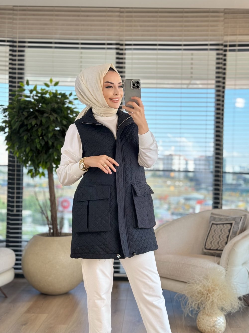 9237 Kapitone Önü Cepli Yelek Siyah