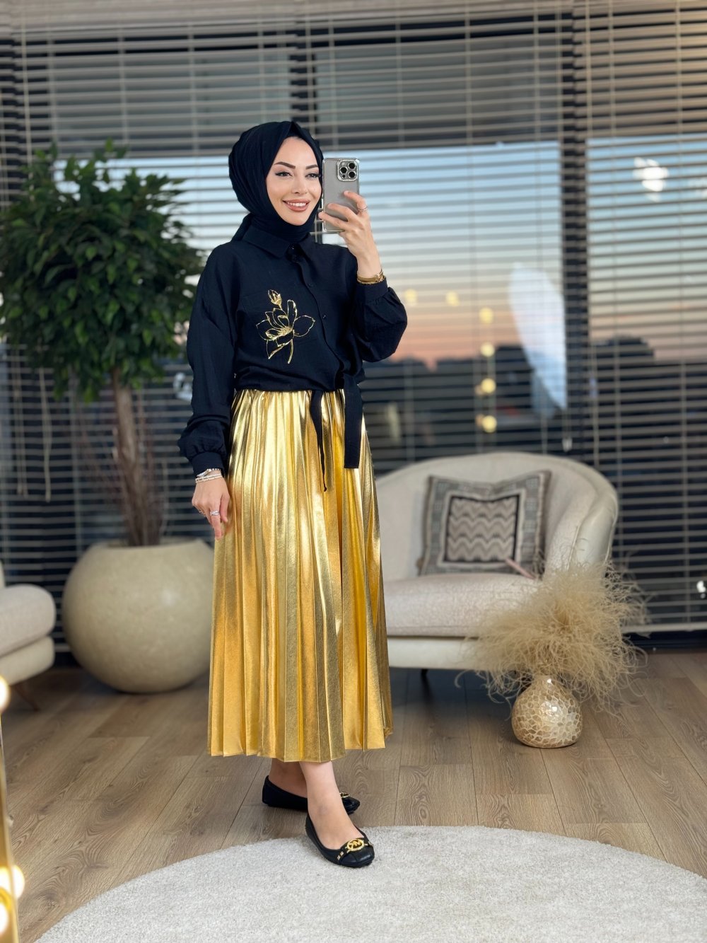 9641 Cebi Çiçek Baskılı Plise Etek Takım Siyah Gold