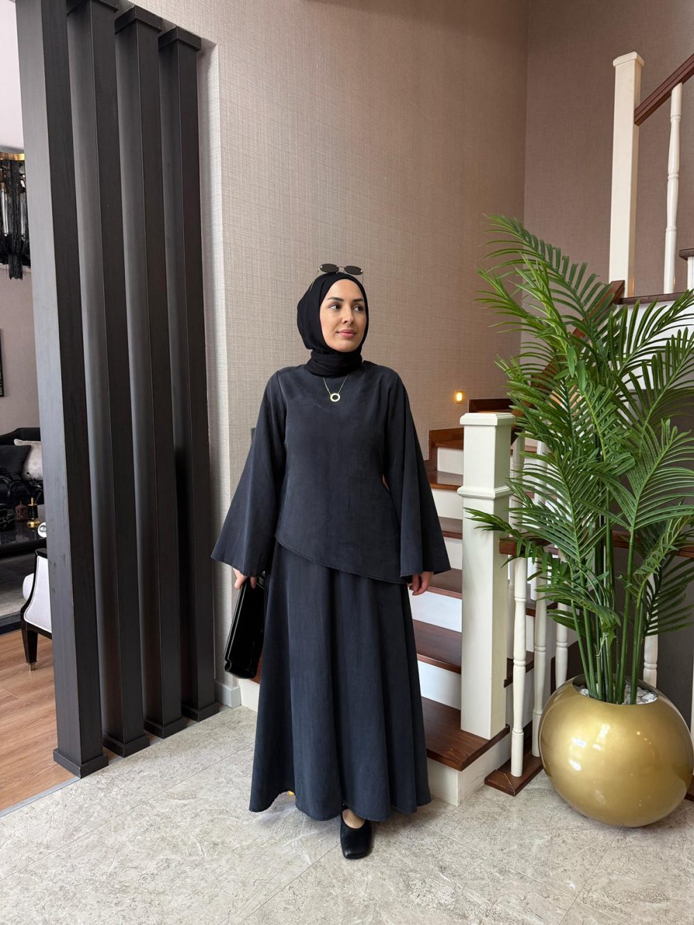 Etek boy 100 cm’dir. Yandan fermuarlı, önü kemerli ve arkadan lastiklidir.