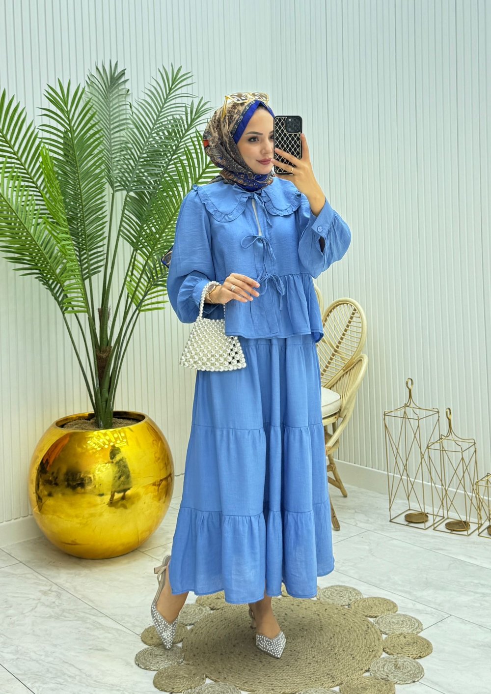 Kimono önden bağlamalıve bebe yakadır kol manşetleri düğmelidir. Etek belden lastiklidir. Astarsız iç göstermez
