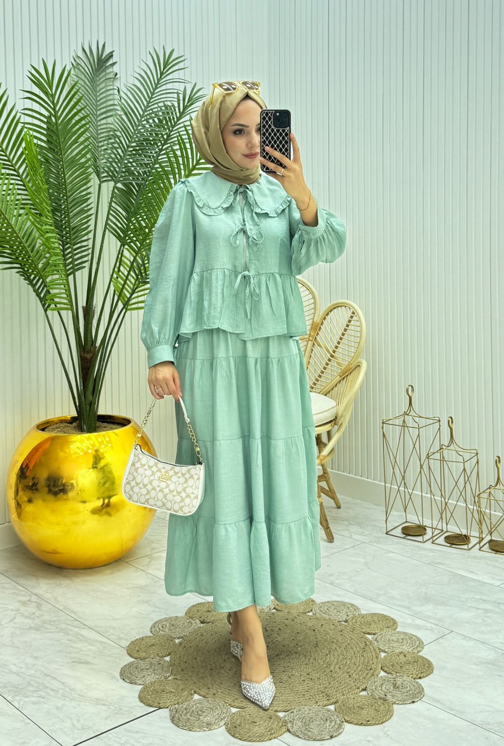 Kimono önden bağlamalıve bebe yakadır kol manşetleri düğmelidir. Etek belden lastiklidir. Astarsız iç göstermez