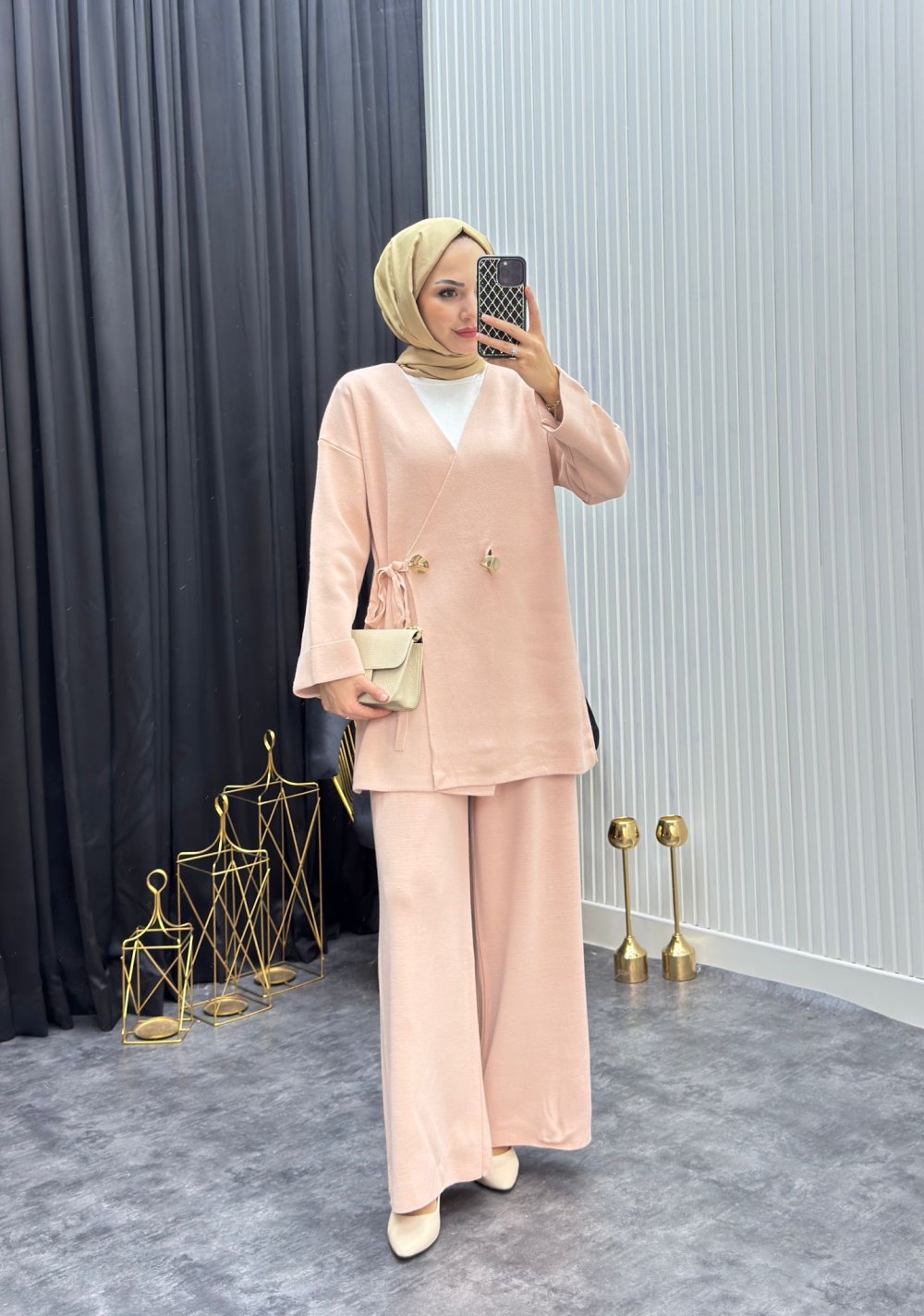 tunik önden düğmeli ve bağcıklı pantolon beli lastiklidir