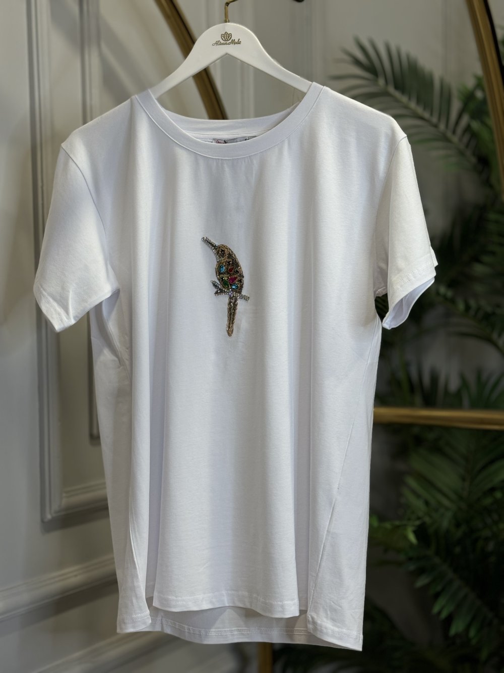 CHD58 Önü Kuş Baskılı Yarım Kollu Tişört Beyaz
