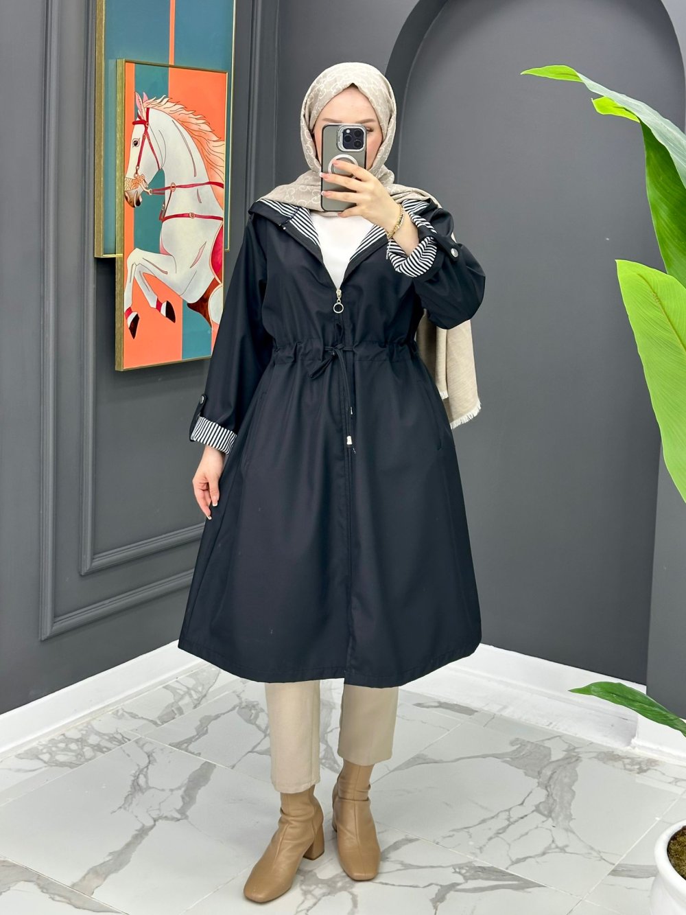 Çizgi Detaylı Trench - Siyah