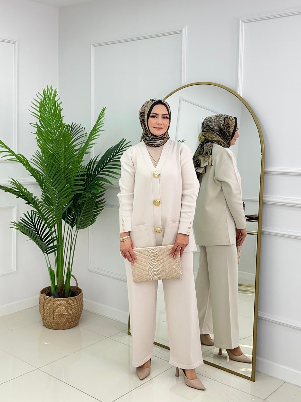 Merserize kumaşın asil duruşu, gold detayların zarafetiyle buluştu.