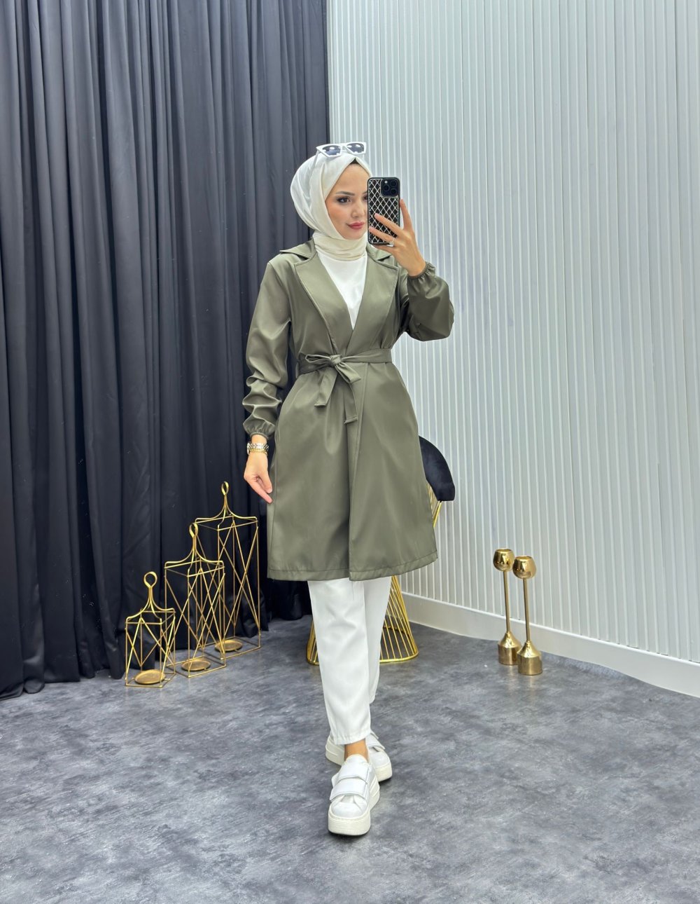 Kruvaze yaka belden seyyar kuşaklı kol manşetleri lastikli yandan çift cepli trençkot.