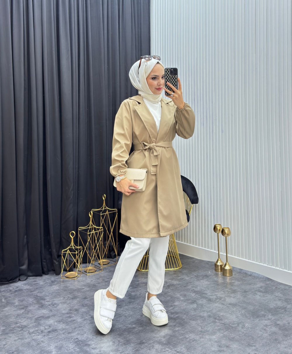 Kruvaze yaka belden seyyar kuşaklı kol manşetleri lastikli yandan çift cepli trençkot.
