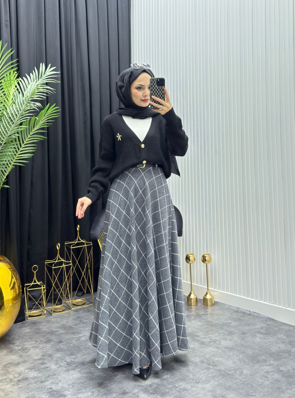 Ürünün Kumaşı;hırka 1. Sınıf triko kumaştan imal edilmiştir etek örme kumaştan imal edilmiştir