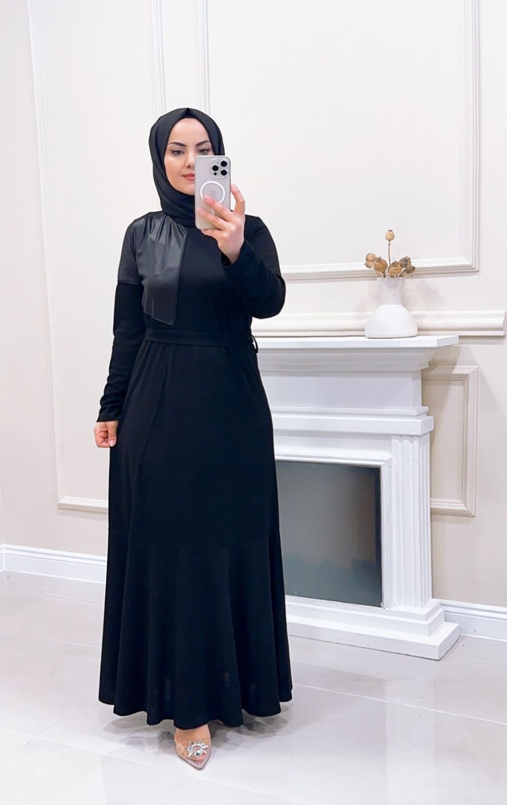 Elbise Deri Garni Yeliz Siyah