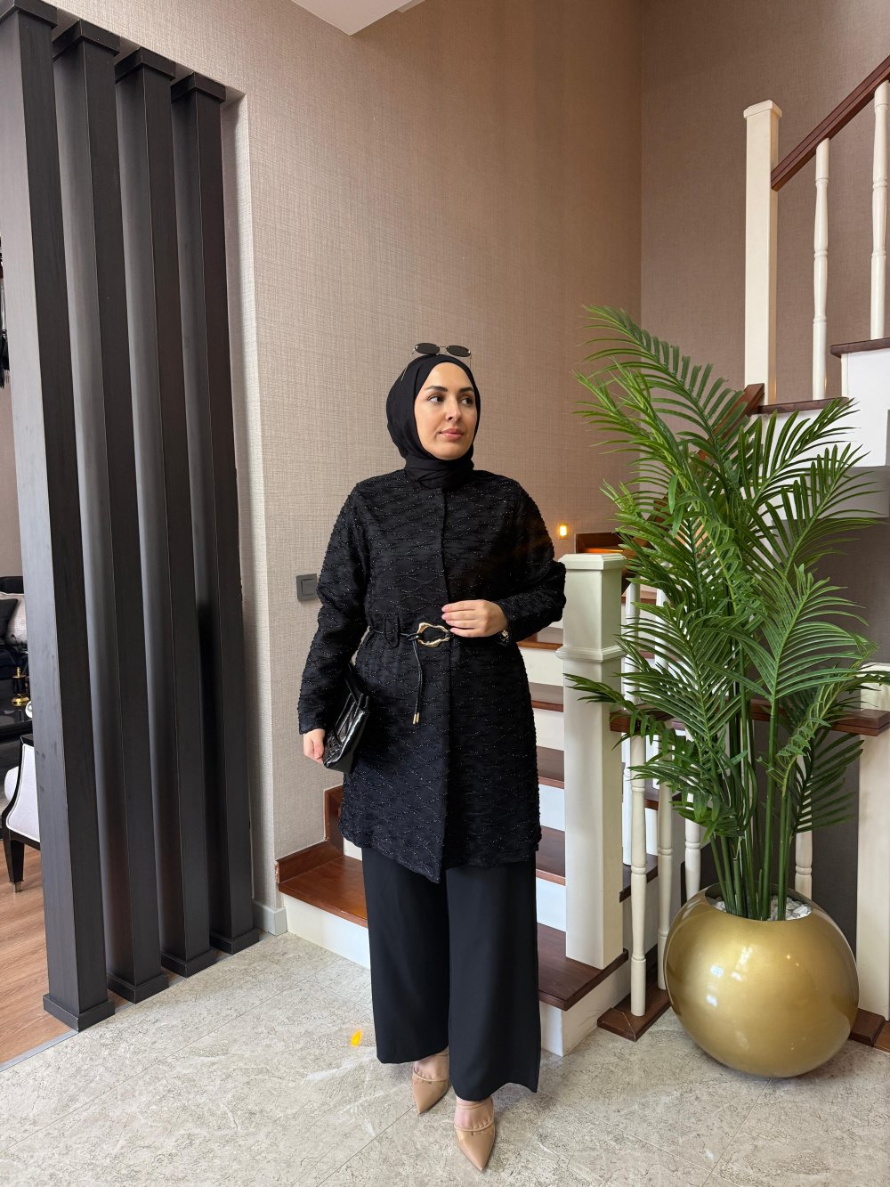 Ceket tül işleme detaylıdır, boy uzunluğu 85 cm’dir. Seyyar deri gold tokalı kemeri bulunmaktadır.
